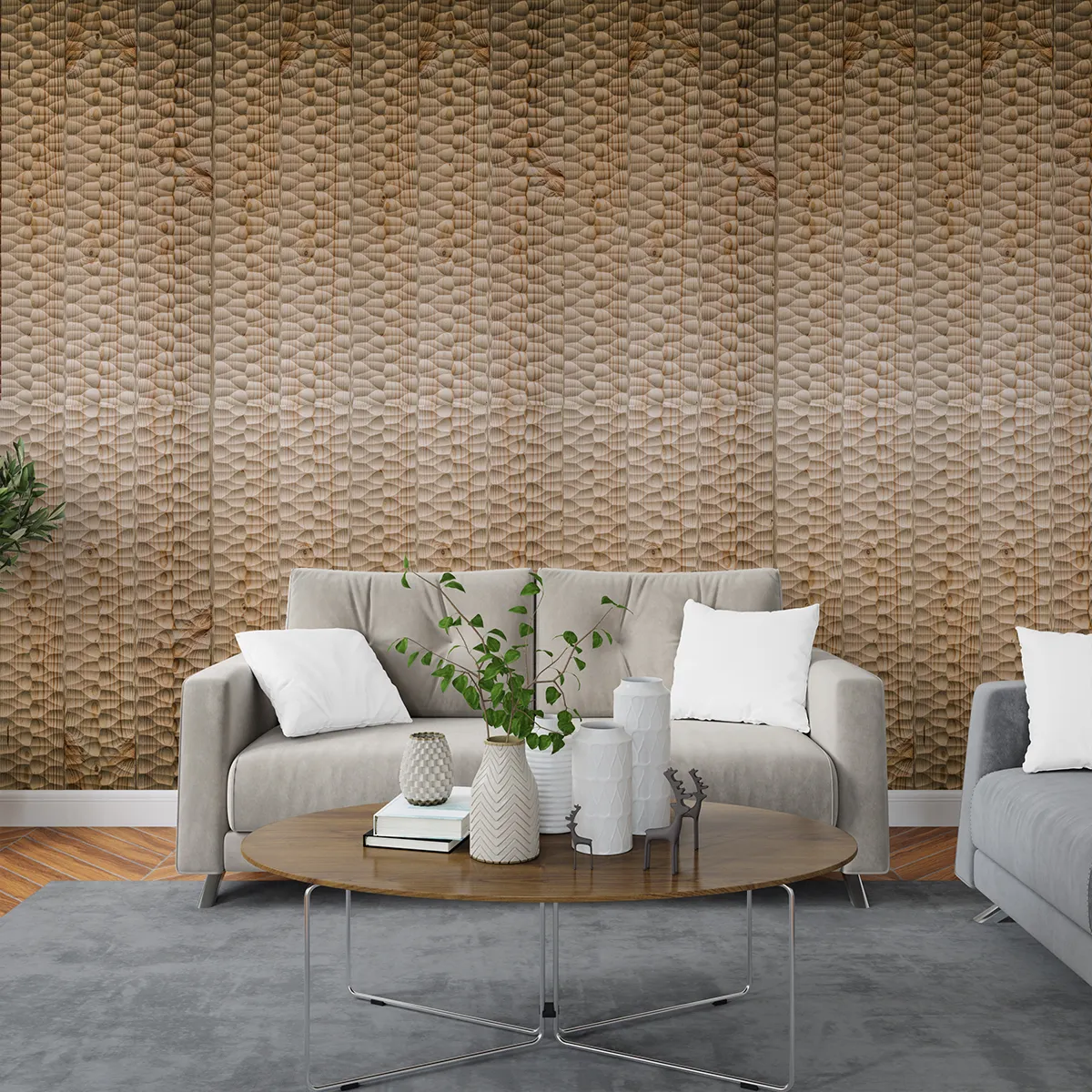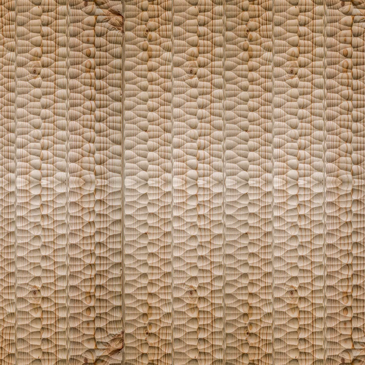 Fiecare panou este realizat din lemn de pin selecționat, pus în evidență printr-o textură tridimensională distinctă și linii fluide ce creează un joc subtil de lumini și umbre. Panoul se remarcă atât prin versatilitatea sa funcțională – putând fi montat ca element central pe perete sau ca separator de spațiu – cât și prin durabilitate și ușurință în întreținere, oferind o notă sofisticată și naturală oricărui decor interior.
